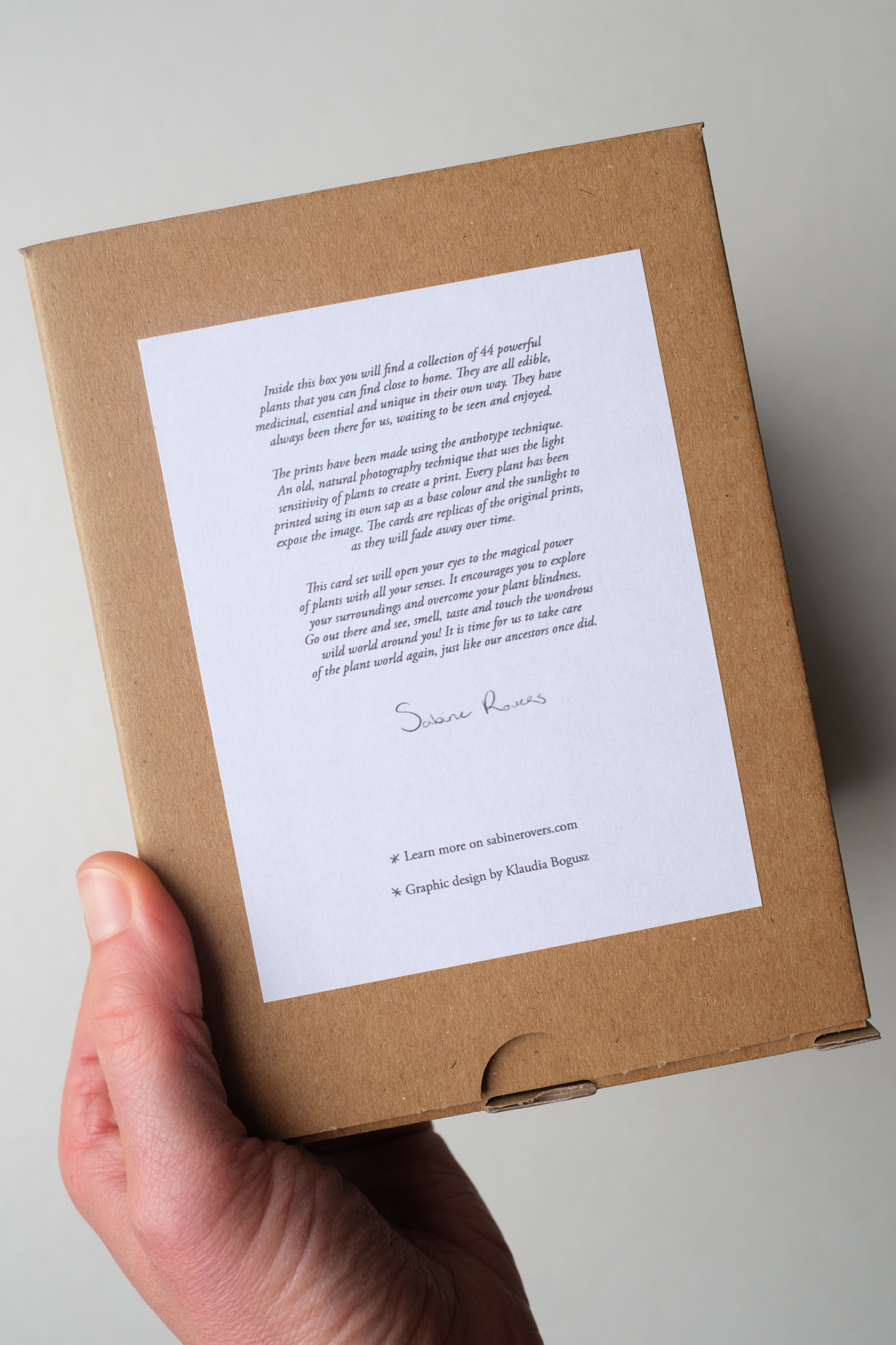 These 44 anthotype prints have been published in a card set. Every plant card contains information about the plant on the back, so you can learn their names, unique characters and stories. Included in the card set is a foraging ethics card and 8 empty cards to add new foraged plants yourself.